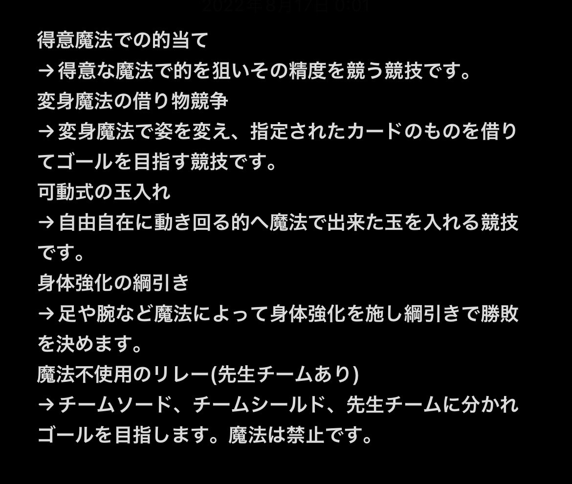 「競技は得意の魔法での的当て、変身魔法をしての借り物競争、」